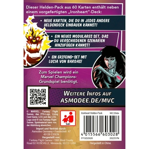 Das Helden-Pack Marvel Champions: Das Kartenspiel – Ironheart enthält ein vollständig spielbares Deck mit 40 Karten, das direkt aus der Schachtel heraus gespielt werden kann. Ironheart konzentriert sich im Laufe der Partie auf die Verbesserung ihres Anzugs. Sie tauscht dazu ihre aktuelle Identitätskarte gegen die nächststärkere aus – bis zu ihrer endgültigen dritten Version. In diesem Helden-Pack finden sich Ironheart, ihre heldenspezifischen Karten und ein komplettes Sortiment an Karten des Führungsaspekts. Außerdem gibt es ein zusätzliches modulares Begegnungsset mit dem bizarren Zzzax. Das Erzfeind-Set lässt Ironheart schließlich gegen den gefährlichen Cyborg Lucia von Bardas antreten.