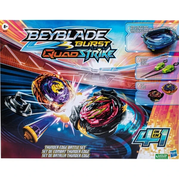 Das Battle erreicht mit dem Beyblade Burst QuadStrike Thunder Edge Battle Set ein neues Level! Mit den Beyblade QuadStrike Kreiseln können noch spannendere Konfrontationen erlebt und heftige Crashs ausgelöst werden. QuadStrike Kreisel verfügen über aktualisierte Spitzen, die entwickelt wurden, um die Leistung beim Battlen zu steigern. Der Kreisel kann auf 4 verschiedene Arten konfiguriert werden. So bieten sich 4 Möglichkeiten, den Kreisel zu individualisieren und eine Strategie zu entwickeln, 4 Modi zum Battlen und 4 Chancen, um zu gewinnen! Dieses Battle-Set enthält alles, was auf dem Weg zum Beyblade-Meister benötigt wird: Eine Beyblade Burst QuadStrike Thunder Edge Beystadium-Arena, 2 rechts-/linksdrehende Starter und 2 rechtsdrehende Kreisel: Den Lightning Pandora Endless P8 G16 QS01 TB15-Q S10 (Ausdauer-/Balance-Typ) sowie den Divine Evo Belfyre B8 G02 QD09 TD18-Q A09 (Angriffs-/Abwehr-Typ). Nun gilt es, die 4 Quad-Zonen der Beystadium-Arena, darunter eine unerwartete Drop-Zone, mit packenden Überraschungsangriffen zu bezwingen.Art.-Nr.: 1894128