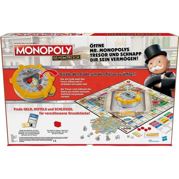 Errate den Code und werde reich: Diese Monopoly-Version für Kinder ab 8 Jahren enthält den Tresor von Mr. Monopoly, in dem sich verschiedene Gegenstände befinden, die den Spielern zu Reichtum verhelfen können. Zunächst muss der Tresor jedoch reichlich befüllt werden. Jedes Mal, wenn ein Spieler es schafft ihn zu öffnen, erhält er dessen Inhalt und der Tresor wird wieder neu befüllt. Dadurch ist der Tresor jederzeit großzügig gefüllt. Zum Öffnen müssen die Spieler den Code erraten, der aus einer zufälligen Zahl zwischen 1 und 6 besteht. Wer genau hinschaut, welche Codes die Mitspieler ausprobieren, hat dabei Vorteile. Nach jeder erfolgreichen Eingabe des Codes wird die Zahl zurückgesetzt, was dieses Brettspiel für 2 bis 6 Spieler umso spannender macht. Neben Monopoly-Spielgeld befinden sich außerdem nur dort zu findende Hotels im Tresor – zusammen mit einem Schlüssel zu verschlossenen Grundstücken. Und wie bei jeder Monopoly-Variante gilt auch hier: wer am Ende das meiste Geld hat, gewinnt! Art.-Nr.: 1871523