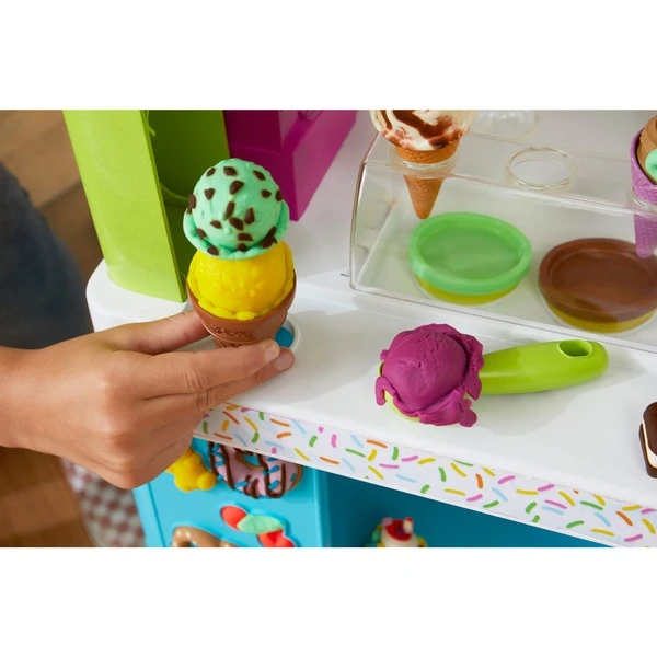 Mit dem großen Eiswagen von Play-Doh wird das Kinderzimmer zu einem ganz besonders coolen Ort, denn erbietet jede Mange Raum für fantasievolle Eiskreationen. Mit 27 Knetwerkzeugen und einer Softeisstation können kleine Eisliebhaber die herrlichsten Leckereien herstellen und dann mit Play-Doh-Streuseln und -Formen nach Lust und Laune dekorieren, bevor sie sie an der tollen Spielzeugkasse abkassieren. Lustige Musik und Kassengeräusche machen das Spielen im Eiswagen noch lebendiger und bei 12 Dosen Play-Doh stehen jede Menge Farben bereit. Art.-Nr.: 1852769