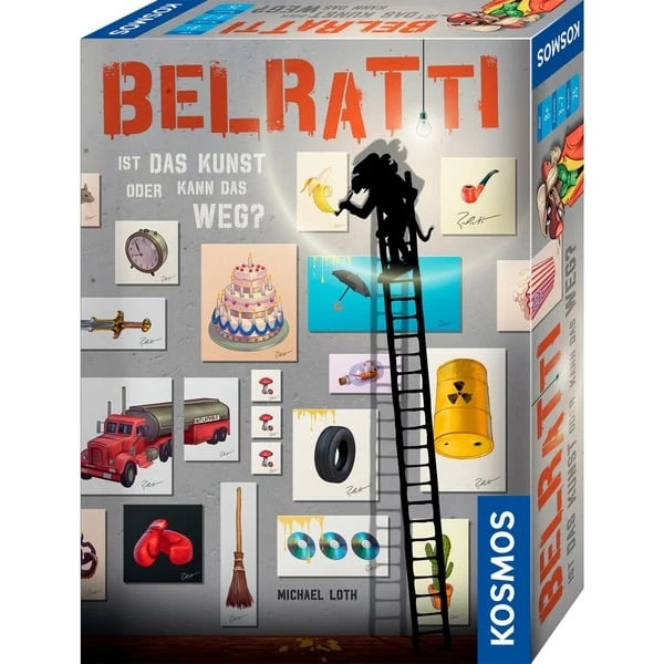 Belratti ist ein kooperatives Bild-Assoziationsspiel. Es wird in zwei Teams gespielt: Als Maler und als Museumsdirekter. Dabei gilt es, Belrattis Kunstfälschungen zu entlarven. Die ersten zwei Spielkarten werden als Themenkarten aufgedeckt. Dann legen die Maler einige passende Bildkarten aus ihrer Hand verdeckt hinzu. Vom Kartenstapel kommen nun noch heimlich vier weitere Karten des Kunstfälschers Belratti hinzu. Jetzt wird aufgedeckt und geraten, welche Karten die Maler abgelegt haben. Schafft es das Team der Museumsleiter, jede Belratti-Fälschung zu enttarnen?Art.-Nr.: 1903585
