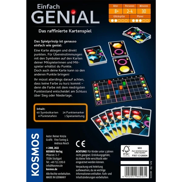 Das spannende Konzept von „Einfach Genial“ als Kartenspiel: Es geht ums Karten ablegen und dabei punkten. Wer die meisten Übereinstimmungen mit den Karten der Mitspieler hat, erhält die meisten Siegpunkte. Doch Achtung: Die anderen Spieler können ihre Karten ebenso nutzen – da heißt es wachsam sein!Art.-Nr.: 1877576