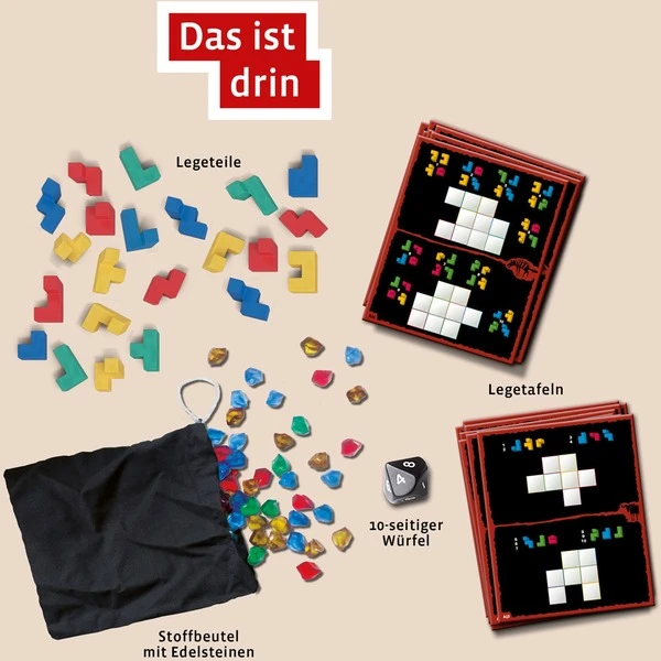 | Inhalt/Ausstattung | 40 Legeteile, 36 Legetafeln mit 504 Aufgaben, Stoffbeutel mit Edelstein, Anleitung | ||