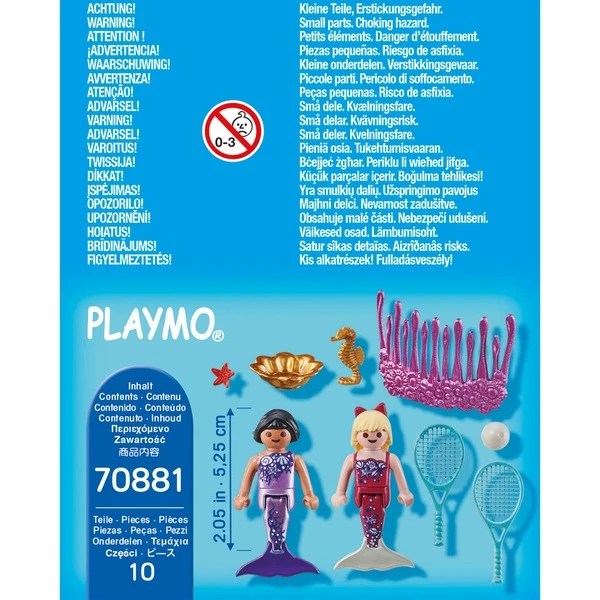 Unter Wasser ist immer jede Menge los. Heute treffen sich die beiden Nixen zum Tennisspielen. Zuerst das Tennisnetz aufstellen, Schläger bereitlegen und dann kann das Spiel beginnen. Der Kamm kann als Tennisnetz oder als Haarschmuck verwendet werden. Die Figuren können sitzen und auf der umgeklappten Schwanzflosse stehen. Art.-Nr.: 1802260