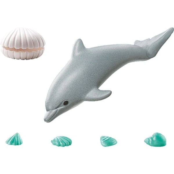 | Inhalt/Ausstattung | Ein schwimmfähiger, junger Delfin mit beweglicher Flosse, eine Riesenmuschel, vier kleine Muscheln und eine Tierwissenskarte. | ||